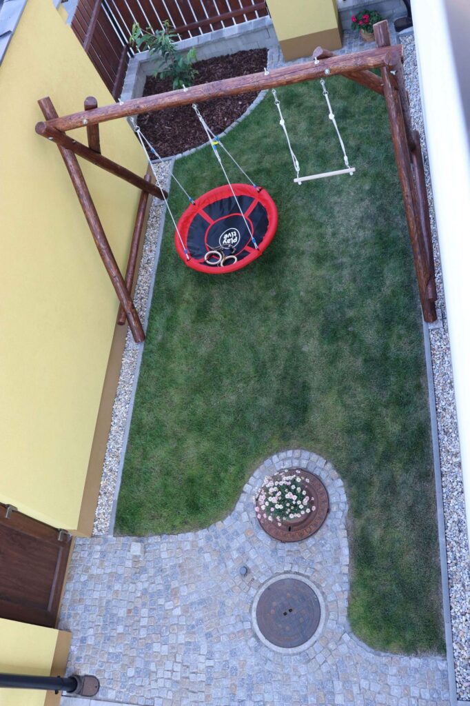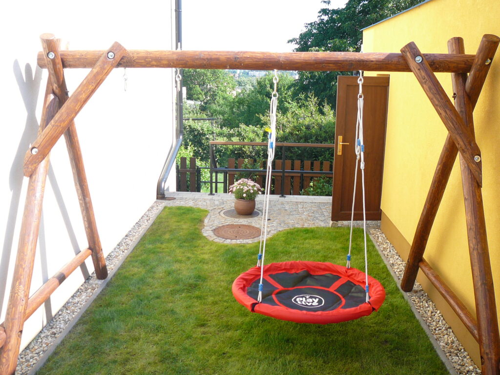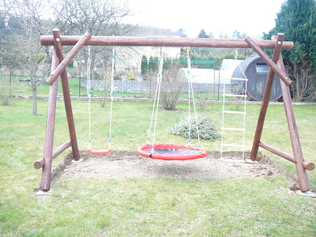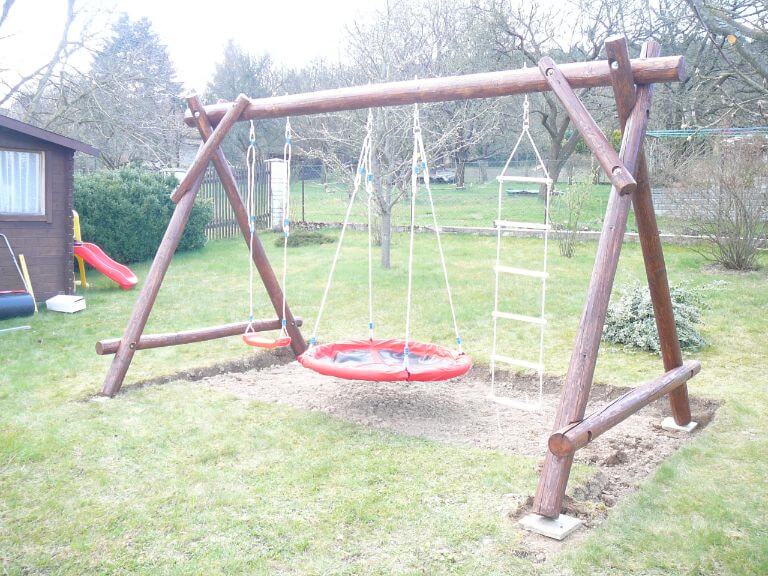Základní sestava pouze s prostorem pro závěsné prvky. Délka této sestavy je přibližně 3,6 m (počítáno 2x houpačka + 1x houpací kruh-hnízdo). Rozměr středového prostoru mezi podpěrami lze přizpůsobit požadavkům. Konstrukce vhodná i do menších prostor. Zajistí dětem radost z houpání.